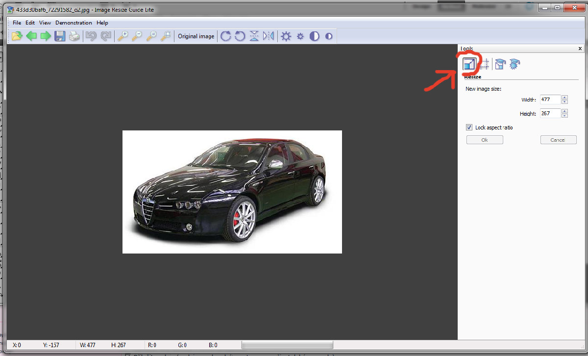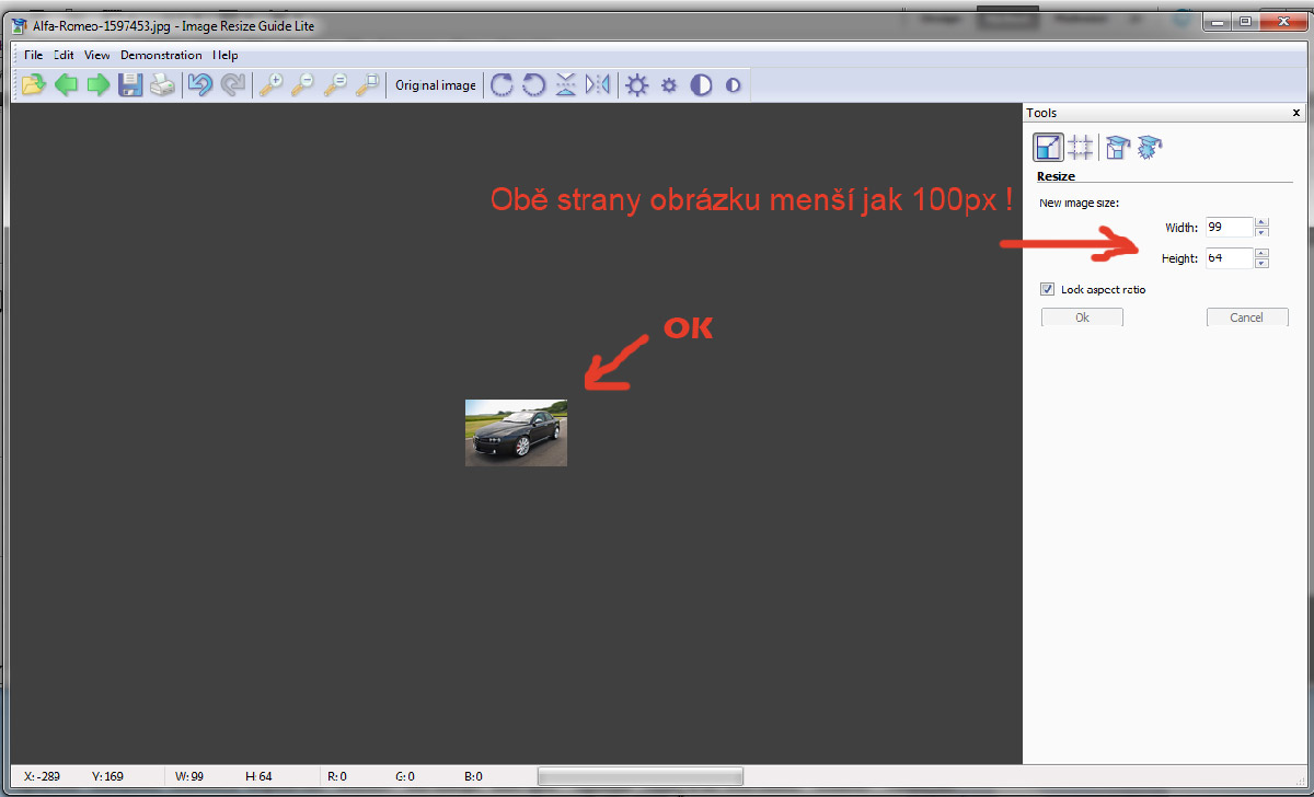 4) Tam máme volbu rozměru obrázku, zatrhněte "Lock aspect ratio" a oba rozměry musejí mít méně jak 100px pak klikněte na OK!